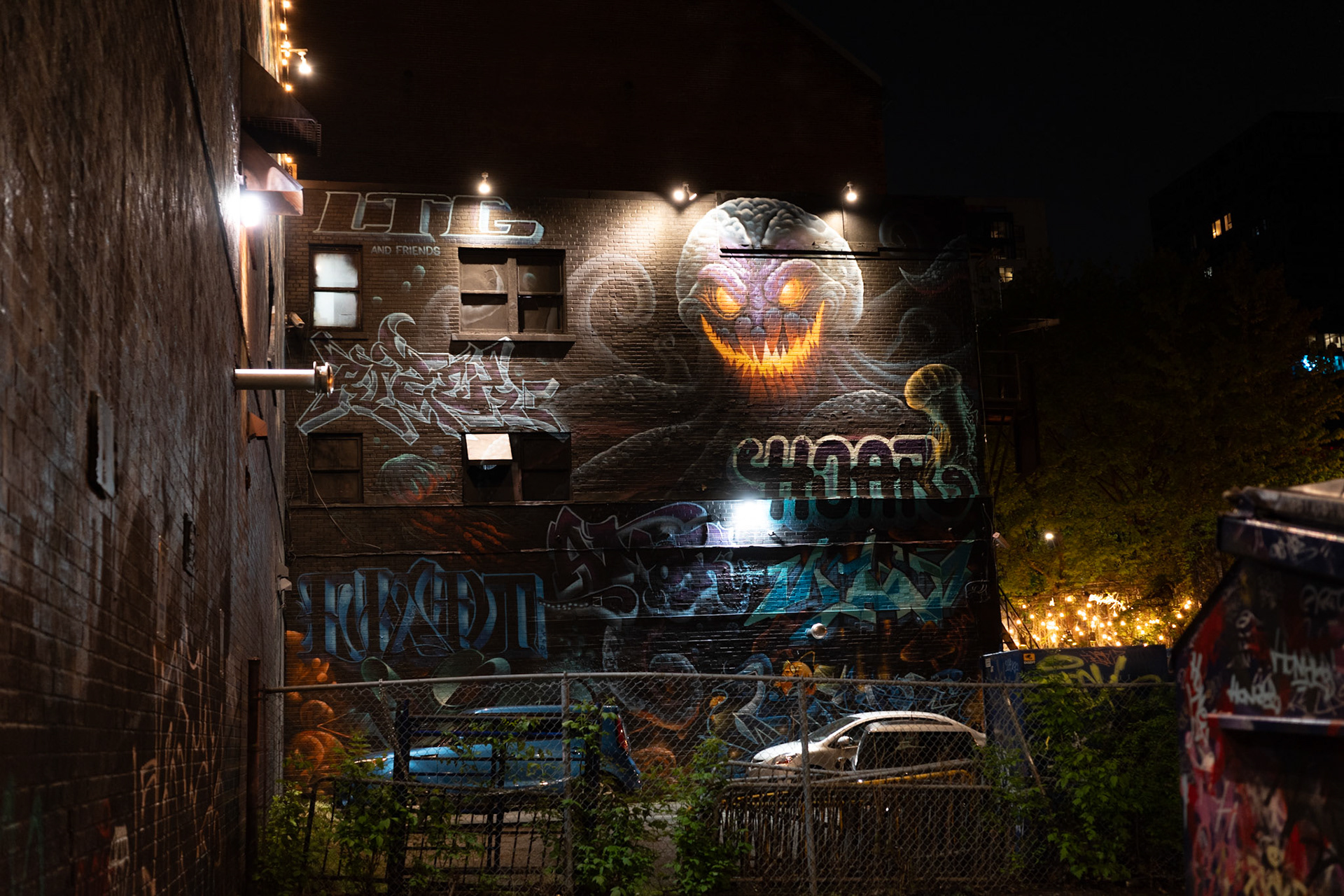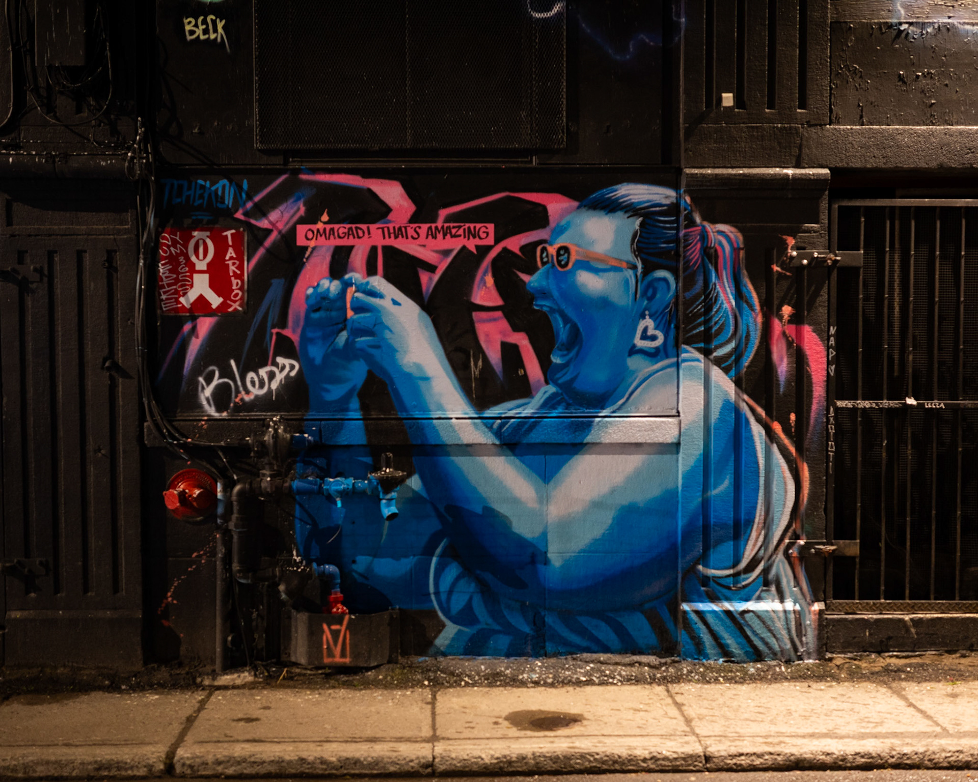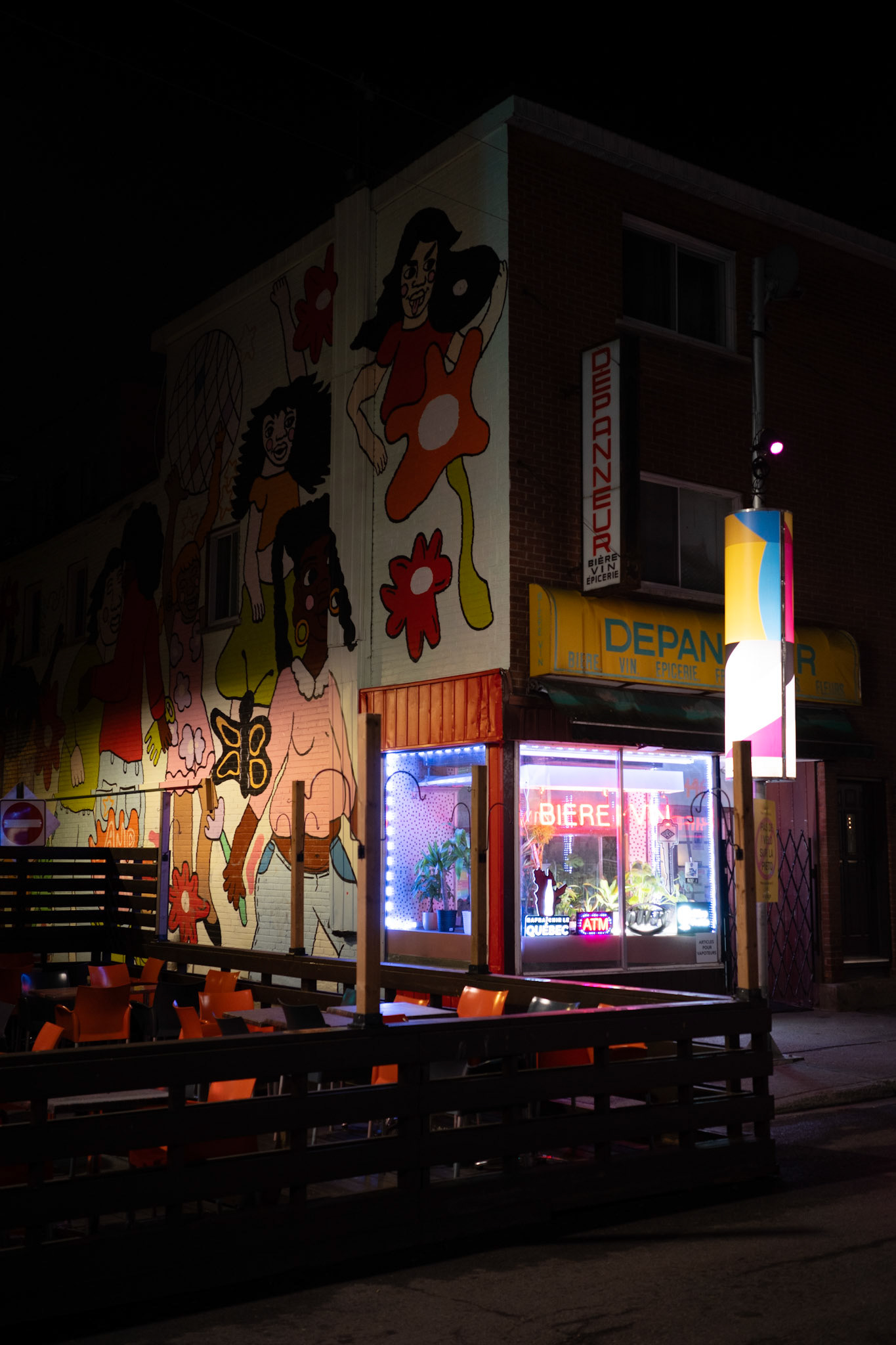Les lumières blanches découpent la nuit, projetant des ombres franches sur les murs couverts de graffitis. L’orangé et le bleu explosent sous cet éclairage froid, tandis que le vert et le beige s’effacent doucement dans la texture du béton. Plus loin, des bâtiments historiques se dressent fièrement, ornés de néons éclatants qui ajoutent une touche rétro-futuriste au décor. La rue devient un théâtre de contrastes, où chaque pas révèle une nouvelle scène lumineuse.