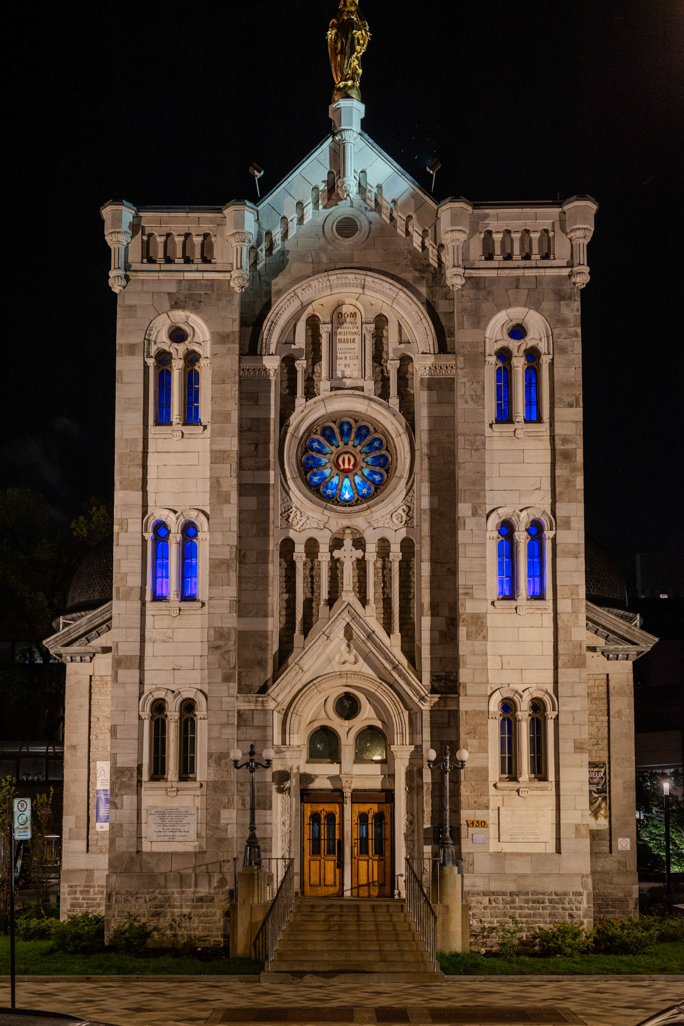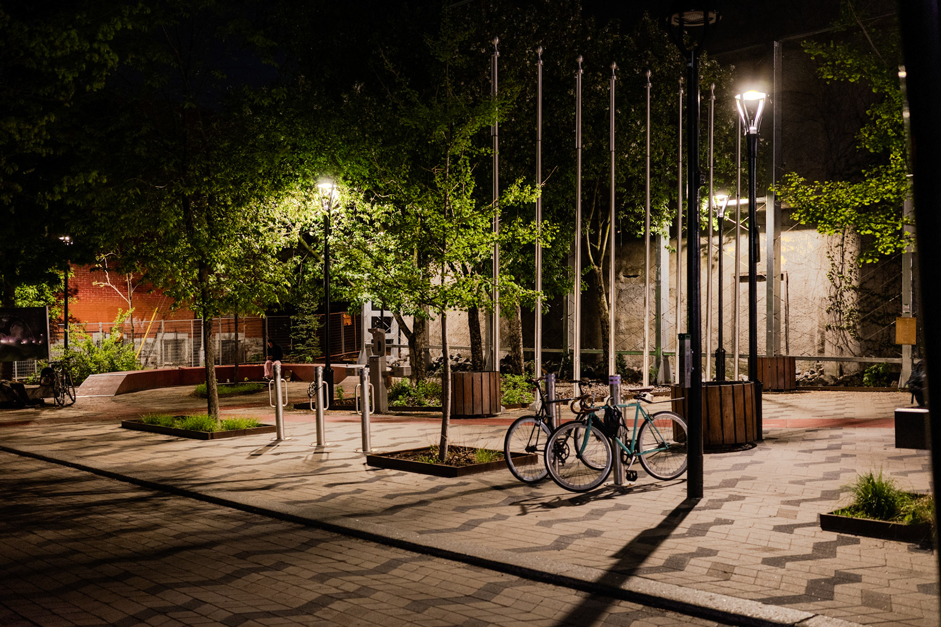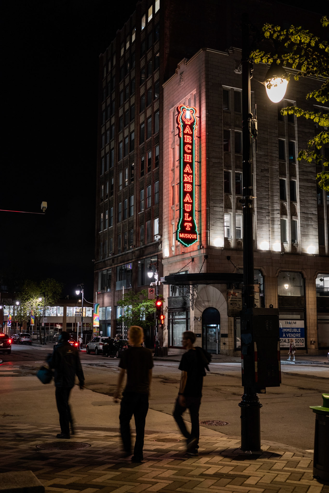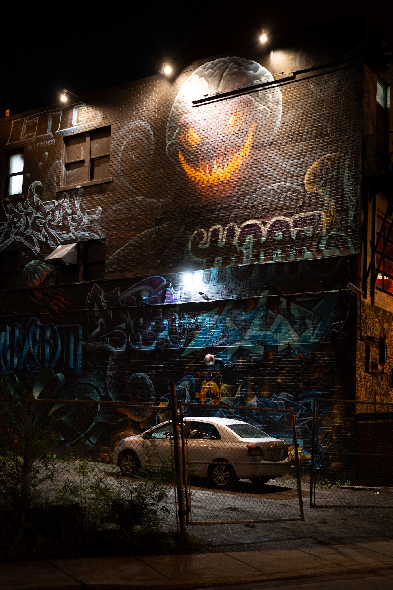 Les lumières blanches découpent la nuit, projetant des ombres franches sur les murs couverts de graffitis. L’orangé et le bleu explosent sous cet éclairage froid, tandis que le vert et le beige s’effacent doucement dans la texture du béton. Plus loin, des bâtiments historiques se dressent fièrement, ornés de néons éclatants qui ajoutent une touche rétro-futuriste au décor. La rue devient un théâtre de contrastes, où chaque pas révèle une nouvelle scène lumineuse.